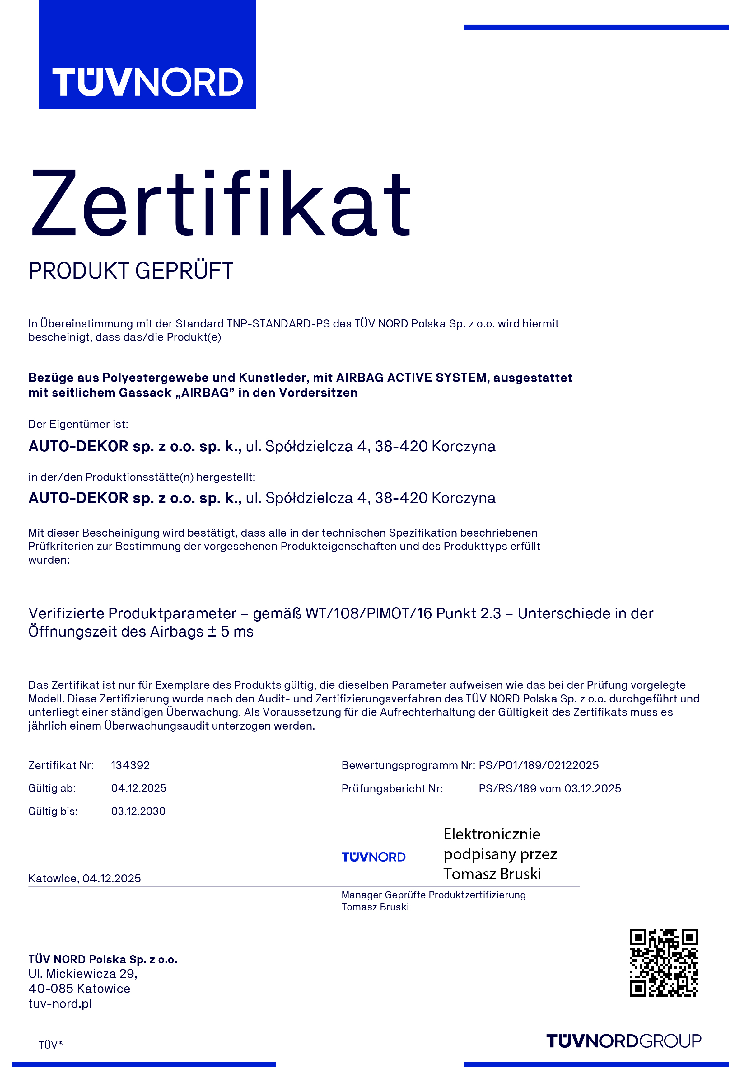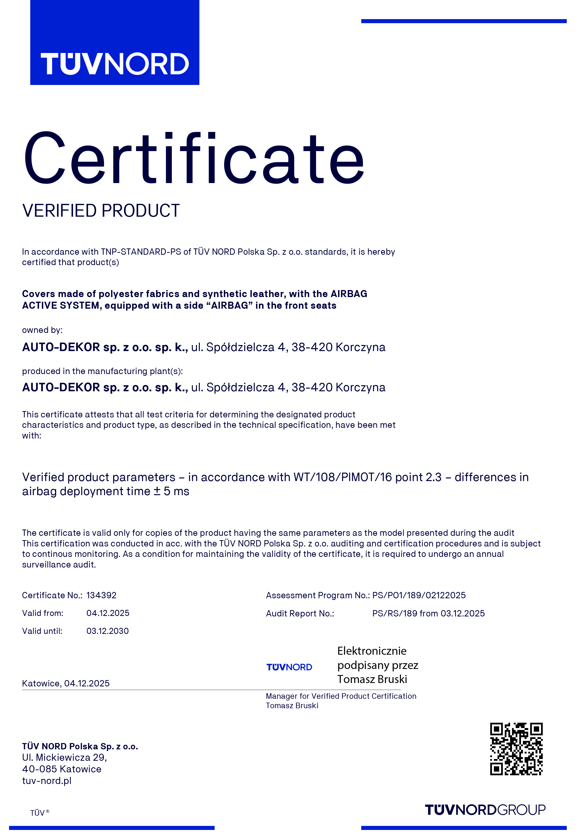 Certyfikat został przyznany na podstawie rygorystycznych, aktualnych badań laboratoryjnych i pozytywnej weryfikacji procesu produkcyjnego oraz warunków techniczno-organizacyjnych w firmie AUTO-DEKOR.