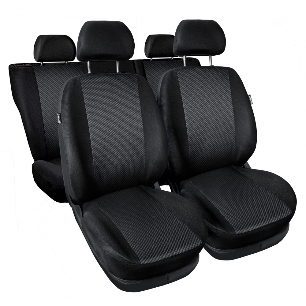 Do produkcji wykorzystywane są materiały tapicerskie w kolorze czarnym, które stanowią boczną część pokrowca, oraz materiał żakardowy w części środkowej, wzorowany na stylistyce oryginalnych tapicerek samochodowych.